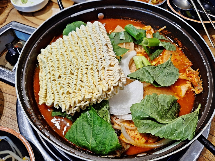 서더리 매운탕. 매운탕에 라면 사리를 하나 추가했다. 난 라면을 즐겨 먹지 않는 편이지만, 이런 매운탕에 라면 사리가 빠지면 괜히 뭔가 아쉽고 서운하지. 서더리 매운 탕에는 우럭 대가리와 광어 뼈가 들어 있었다. 아무래도 가장 대중적인 생선이기 때문에 이런 조합으로 넣은 거 같다.