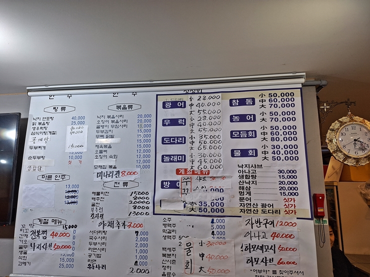메뉴. 이런 실내 포차 특성상 선어 회는 나오지 않고 활어 회가 메인이다. 활어 회로 광어, 우럭, 도다리, 놀래미, 참돔, 농어, 아나고와 하모 회를 판매하고 있다. 아나고와 하모는 각각 붕장어와 갯장어인데, 아나고와 하모란 이름이 더욱 친숙하다. 우리는 무엇을 먹을까 하다가 짝꿍이 도다리 세꼬시를 한 번 도 먹어보지 않았다고 해서 도다리 세꼬시 소 사이즈를 주문했다. 가격이 상당히 저렴한 것이 특징이다.