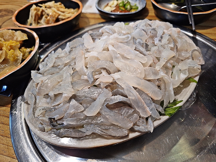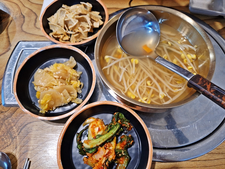 기반 반찬. 시원한 콩나물국, 어묵 볶음, 묵은지와 열무 김치가 나온다. 시원한 콩나물국이 상당히 인상 깊었는데 적당히 간이 되어 있어서 소주 한 잔 마시고 떠서 마셔보니 술이 저절로 해장 되는 느낌이었다. 반찬 가짓수가 많지 않지만 하나하나 모두 정갈한 것이 특징이었다.