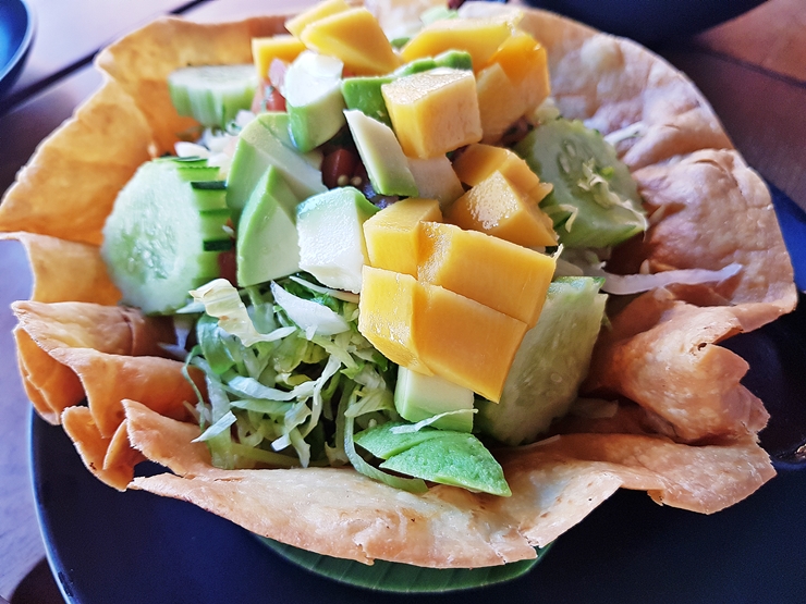 타코 샐러드. 토르티야를 튀겨 그릇처럼 만든 후 그 안에 과카몰리, 망고, 오이와 채소를 넣은 것이다. 채소를 열심히 먹으라는 짝꿍의 말을 새겨 듣고 이렇게 해외에서도 채소를 찾아 먹었다. 나이가 들어서 그런지 이제 예전만큼 고기가 쉽게 소화 되지 않는다.