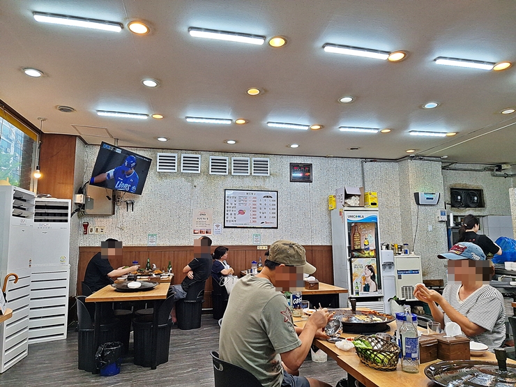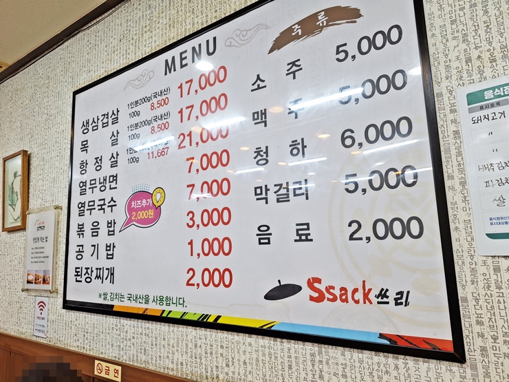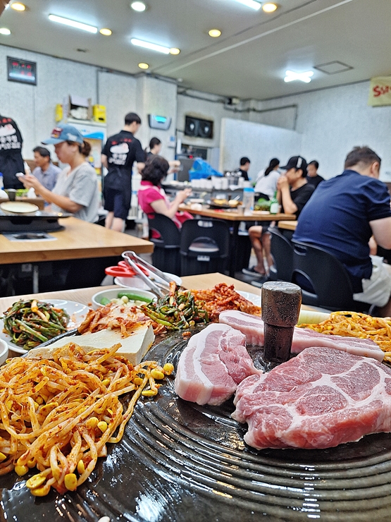 여전히 많은 고객들로 북적이는 싹쓰리삼겹살. 이날 굉장히 덥고 습했는데, 내부는 굉장히 쾌적했다. 우리는 비어있는 자리 중에서 가장 시원한 자리에 빠르게 앉았다. 역시 자리 선점을 위해서는 재빠른 행동이 필요하다. 우리 모두 좋은 자리를 차지하기 위해서 순발력을 기르는 훈련을 꾸준히 하도록 하자.
