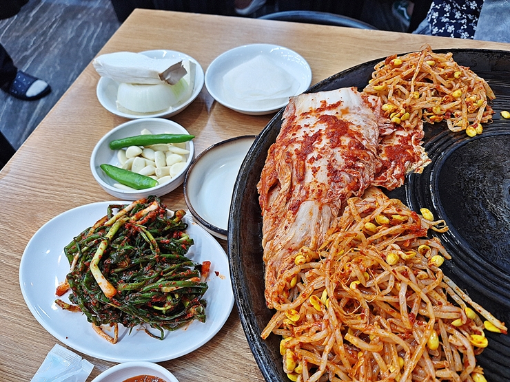 여전한 반찬. 새송이 버섯, 양파, 쌈무, 고추, 두부, 마늘, 파김치, 콩나물, 김치와 쌈장이 나온다. 싹쓰리삼겹살의 특징은 큰 가마솥 뚜껑에 콩나물, 김치와 파김치를 올려 먹는 다는 것이다. 처음부터 푸짐하게 주면서, 필요할 경우 리필도 가능하다. 우리는 리필을 한 적이 없지만 주변을 보니 상당히 많이 리필을 하는 것 같다.