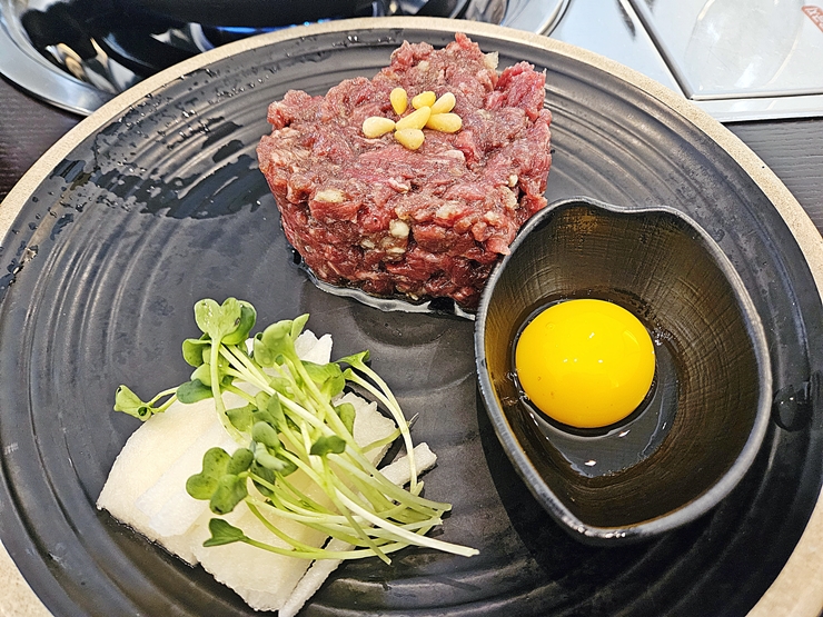 육회. 홍두깨 살을 사용해 만든 육회와 함께 계란 노른자, 배와 무순이 함께 나온다. 사진에서는 표현이 제대로 되어 있지 않은데, 하트 모양으로 나오는 것이 인상 깊었다. 계란 노른자를 잘 섞어서 한 입 먹어보니 고소한 맛이 일품이다. 역시 고기는 어제 어디서 누구와 어떻게 먹어도 맛있다.