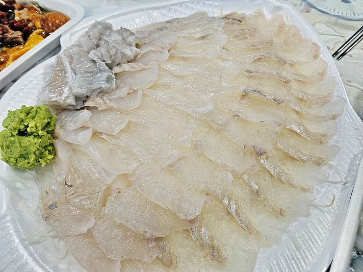 아름다운 대광어 회의 모습. 아 너 이 녀석, 살아있을 때도 참 아름답더니 이렇게 회가 되었을 때도 여전히 아름답구나. 토이가 부릅니다. 여전히 아름다운지. 크기가 크기 때문에 엔가와로 불리는 뱃살 역시 상당하다. 사실 광어는 뱃살은 없고 지느러미 살이다. 뱃살은 참치와 내가 가지고 있지. 활어 회는 선어 회만큼의 회 본연의 맛을 느낄 수 없지만 선어 회에서 느낄 수 없는 식감을 느낄 수 있다. 활어 회를 먹으면서 숙성이 어떠니 맛이 덜 한다는 등의 말은 귀 담아 들을 필요가 없다.