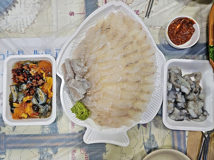 짠. 우리가 주문한 대광어 회가 왔다. 태평양수산에서 낙지, 멍게와 해삼을 서비스로 넣어 주었다. 해병대가 아님에도 이런 서비스라니. 참으로 좋은 서비스가 아닐 수 없다. 내가 해병대였더라면 여기에 뭔가 더 추가가 되었겠지. 이럴 때는 해병대를 가지 않은 것이 아주 살짝 조금 아쉽다.