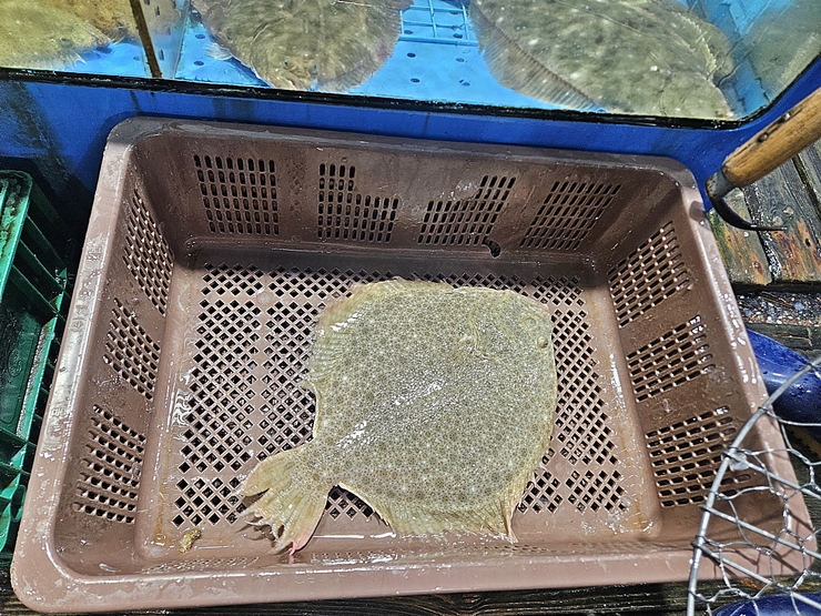 우리가 고른 대광어. 사진으로는 사이즈가 작게 나왔지만 상당한 크기를 자랑했다. 너란 녀석, 참으로 고마운 녀석. 농수산물시장에서 생선을 구매할 경우 선어 회가 아닌 활어 회로 먹지만, 그 나름의 정취와 맛이 있다. 생선을 고른 후 2층에 있는 초장 집으로 올라가면 된다.