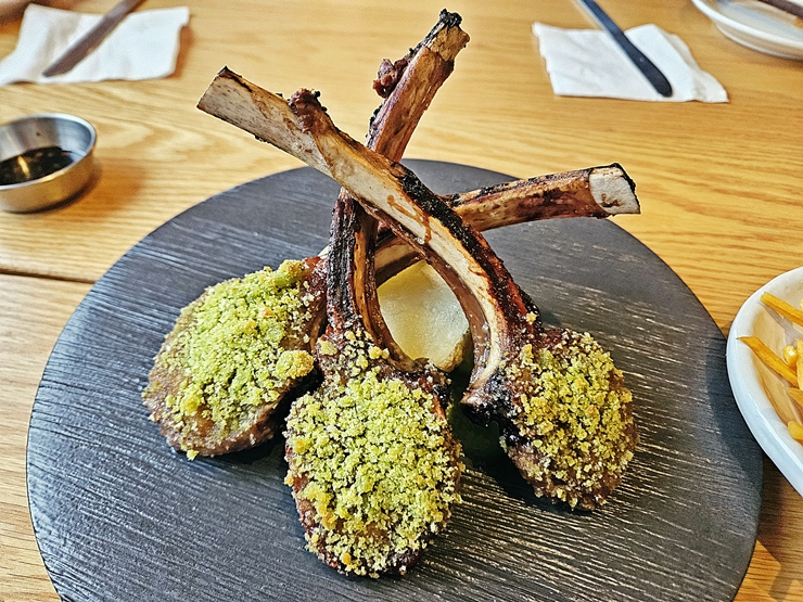 프렌치 랙. 양갈비는 프렌치 랙과 숄더 랙으로 나누는데, 숄더 랙이 좀 더 대중적으로 볼 수 있는 부위이다. 프렌치 랙은 숄더 랙에 비해 크기가 작고 비싸지만 부드러움과 고소한 맛을 자랑한다. 뉴라디오의 프렌치 랙은 프렌치 랙 특유의 맛을 잘 살려 구웠다. 오, 이 집 맛집이네.