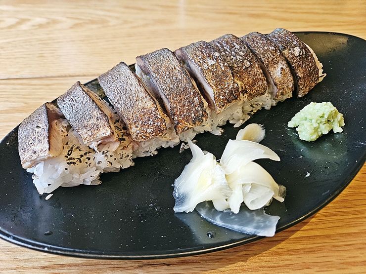 고등어 초밥. 고등어 초밥은 토치를 사용해서 가볍게 불에 그을려서 나온다. 고등어는 회로 먹어도 맛있고 구이로 먹어도 맛있고 조림으로 먹어도 맛있고 찜으로 먹어도 맛있고 초밥으로 먹어도 맛있는 참으로 고마운 생선이 아닐 수 없다. 질이 좋지 않거나 숙성을 잘못한 고등어를 사용해서 초밥을 만들 경우 굉장히 비리기 마련인데 그런 비릿함은 전혀 느낄 수 없었다.