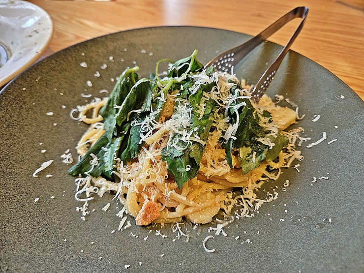 명란 오일 파스타. 지극히 정석적인 명란 오일 파스타의 맛이다. 오일 파스타는 기본기가 참 중요한데, 이런 기본기를 갖추지 못한 곳을 갈 때면 참으로 입이 썩기 마련이다. 하지만 뉴라디오의 명란 오일 파스타는 화려한 맛은 없지만 기본을 제대로 갖춘 파스타여서 만족감이 높았다. 자양동에서 힙한 곳을 찾는다면 한 번 가볼 것을 추천하는 곳이다.