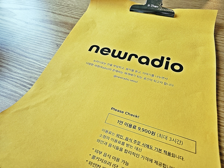 뉴라디오는 잔을 부딪히고 음악을 듣고 어쩌고 저쩌고 설명이 적혀 있다. 중요한 것은 아니니 그냥 한 번 보고 넘어가기로 한다. 특이하게 1인 이용료가 있고 시간 제한까지 있다. 일본의 자릿세와 비슷한 것 같다. 바에서는 종종 봤지만 이제 한국 식당에도 자릿세가 생기다니. 오, 세상에 맙소사. 이러다 팁까지 정착할 거 같다. 어찌 되었든 우리는 이왕 온 거 이 시간을 즐기기로 했다.