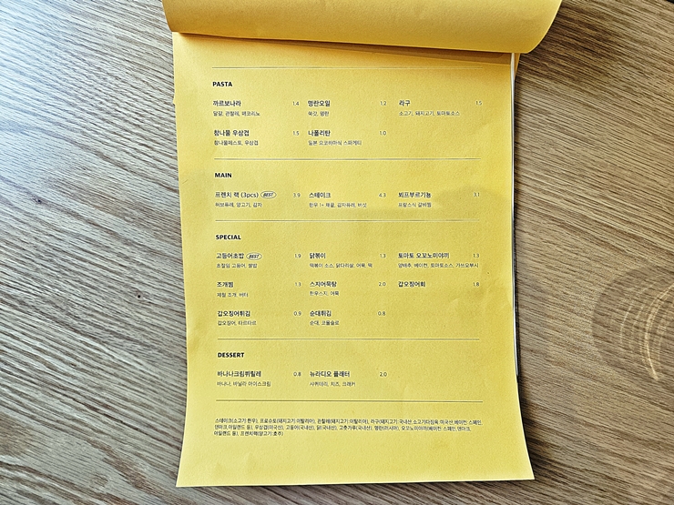 메뉴. 좋게 말하면 메뉴의 스펙트럼이 넓고, 나쁘게 말하면 근본이 없다. 굉장히 다양하고 많은 메뉴를 판매하고 있다. 파스타는 까르보나라, 명란 오일, 라구, 참나물 우삼겹과 나폴리탄 파스타를 판매하고 있고, 메인 메뉴로는 프렌치 랙, 스테이크와 비프 부르기뇽을 판매하고 있다. 그 밖에 고등어 초밥, 닭볶이, 토마토 오꼬노미야끼와 조개찜 등도 판매하고 있다. 이왕 즐기기로 한 거 최대한 다양한 메뉴를 음미하기로 했다. 역시 모든 것을 잘 수용하는 멋진 나.