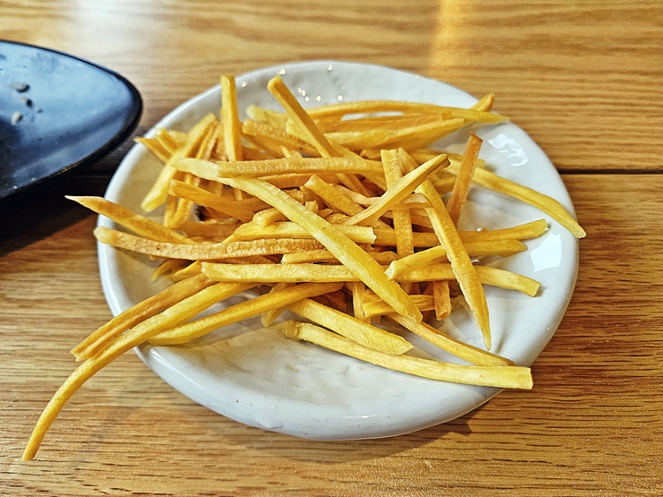 기본 안주로 나오는 고구마 스틱. 난 치아가 좋지 않기 때문에 딱딱한 음식을 좋아하지 않는다. 그래서 최대한 조심해서 먹었지. 바삭함이 잘 살아 있었고 고구마 특유의 달고 고소한 맛이 잘 느껴졌다.