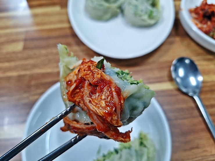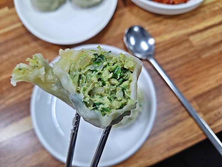당면, 고기와 채소가 들어간 만두다. 향을 살짝 맡아 보니 후추 향도 은은하게 느껴진다. 간장을 찍지 않고 그대로 먹어봤는데 자극적이지 않으면서 깊은 맛을 나타낸다. 오, 상당히 잘 만든 수제 만두다. 만두는 어떻게 만들어도 맛 없게 만들기가 더 어려운 음식이라서 그 수준을 가늠하기 어렵다. 그래서 뭘 먹어도 평타는 치는 것 같은 느낌이 드는데, 태백칼국수의 만두는 그 평타를 훌쩍 뛰어넘는 맛이었다.