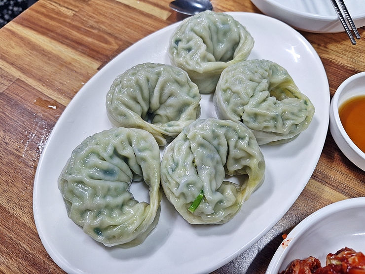 만두. 생긴 것을 보면 딱 비비고 왕만두다. 그래서 설마 시판인가 잠시 실망스러웠는데, 직접 빚은 만두라고 한다. 그렇다면 안심하고 한 번 먹어봐야지. 만두는 5개가 나온다. 만두가 8,000원이니 한 개에 1.600원 꼴이구나. 저렴한 가격은 아니다.
