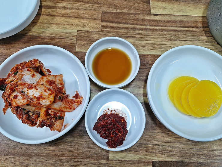 반찬으로는 겉절이와 단무지가 나온다. 거기에 취향에 따라 칼국수에 넣을 양념장과 만두 소스인 간장이 나온다. 자고로 칼국수 가게에서는 김치나 겉절이가 맛있어야 한다. 태백칼국수의 겉절이는 상당히 맛이 좋았다. 아삭 거리는 식감이 잘 살아 있었고 젓갈의 비린 맛도 많이 느껴지지 않았다. 단무지는 그냥 시판 단무지 맛이기 때문에 자세한 설명은 생략 하기로 한다.