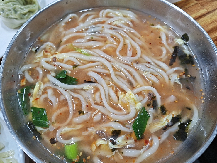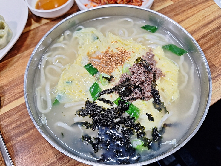칼국수. 국물이 진하지 않고 살짝 맑은 색이다. 고명으로는 계란, 고기, 깨, 파와 김이 올라갔다. 국물을 한 모금 마셔보니 요새 유행하는 그런 진한 국물 맛이 아니다. 그런데 뭔가 오묘하게 중독인 맛이다. 전 날 과음을 했는데 속이 편안하게 바뀌는 맛이었다.