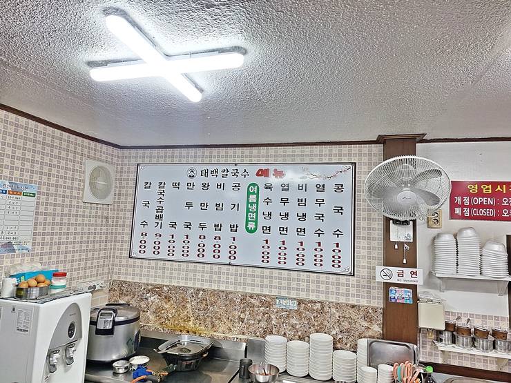 메뉴. 칼국수와 만두만 팔 거라 생각했는데, 다양한 음식들을 판매하고 있다. 칼국수, 떡국, 만둣국, 만두와 비빔밥을 상시로 판매하고 있고, 여름에는 육수 냉면, 열무냉면, 비빔냉면, 열무국수와 콩국수를 판매하고 있다. 육수 냉면은 뭔지 물어봤는데 그냥 흔하게 먹을 수 잇는 칡냉면이라고 한다. 우리는 당연히 칼국수와 만두를 주문했다.