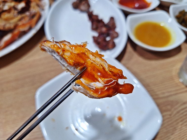 양념 소스도 찍어서 맛있게 냠냠. 양념 소스도 맛있긴 하지만 겨자 소스가 더 잘 어울린다. 이건 개인의 취향 차이이기 때문에 어떤 소스를 찍어 먹어도 맛있게 먹을 수 있다. 물론 그냥 먹어도 고소함과 담백함을 잘 느낄 수 있으니 알아서 잘 먹도록 하자. 인덕원에서 맛있는 통닭과 치킨을 먹고 싶다면 꼭 한 번 가볼 곳으로 추천하는 곳이다.