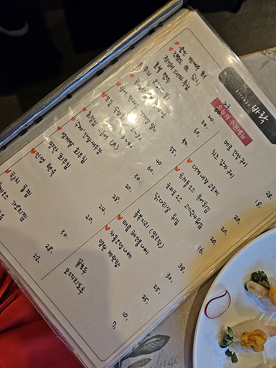 메뉴. 퓨전일식집답게 다양한 퓨전일식 메뉴를 판매하고 있다. 요새 무늬오징어가 각광을 받고 있는데 왜 갑자기 이렇게 각광을 받고 있는지 모르겠다. 주요 메뉴로는 모둠 숙성 회, 초절임 고등어, 메로 간장 구이, 대게 내장 고로케, 트러플 소스 문어 튀김 등이 있다고 한다. 우린 다양한 메뉴를 맛보기로 결정해서 광어 단새우 성게알 말이, 모둠 숙성 회와 차돌 숙주 볶음을 주문했다.