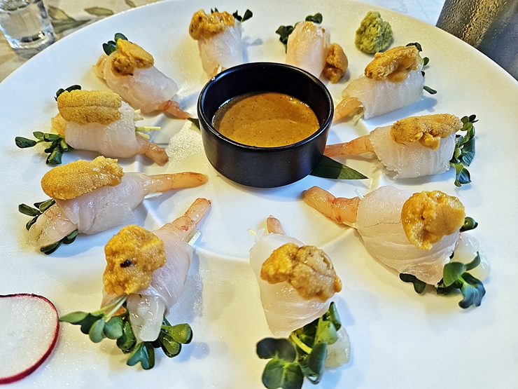 광어 단새우 성게알 말이. 참으로 어려운 이름이다. 하지만 난 이렇게 어려운 이름도 쉽게 잘 외울 수 있다. 이것이 바로 뛰어난 나의 암기 능력. 어릴 때부터 국영수를 중심으로 예습과 복습을 철저히 해서 그런지 암기 능력이 뛰어나다. 광어 단새우 성게알 말이는 이름 그대로 무순과 단새우를 광어에 넣어 말은 후 그 위에 성게 알을 올린 것이다. 각각 먹어도 맛있기 그지 없는데, 이런 것들을 조합하면 맛이 없을 수가 없다. 이런 음식을 맛없게 만들면 그게 바로 능력이다.