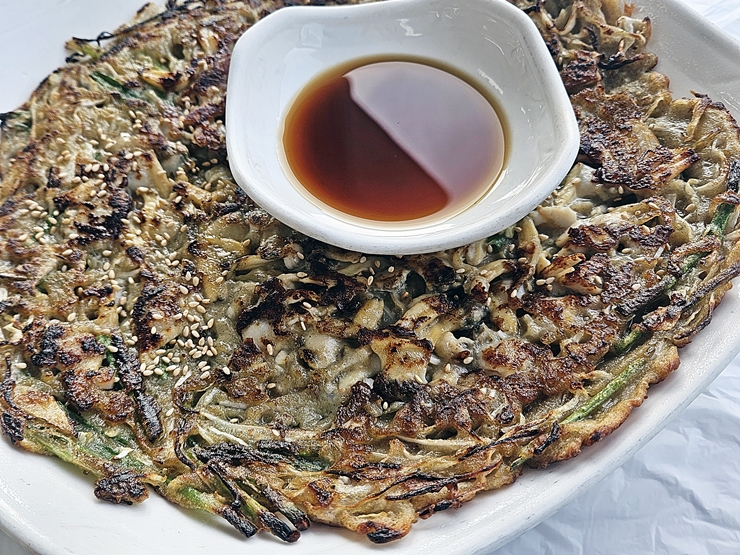 메밀 바지락 전. 부침 가루를 메밀 가루로 대체해서 부친 전이다. 상당히 많은 양의 바지락과 함께 미나리를 넣어 부쳤다. 바지락과 미나리의 조합은 실로 훌륭하기 그지 없지. 몇 년 전까지만 해도 큼직하고 두꺼운 전이 유행을 했던 적이 있었는데, 전은 역시 이렇게 얇고 넓게 만들어서 바삭하게 먹는 것이 맛있다.