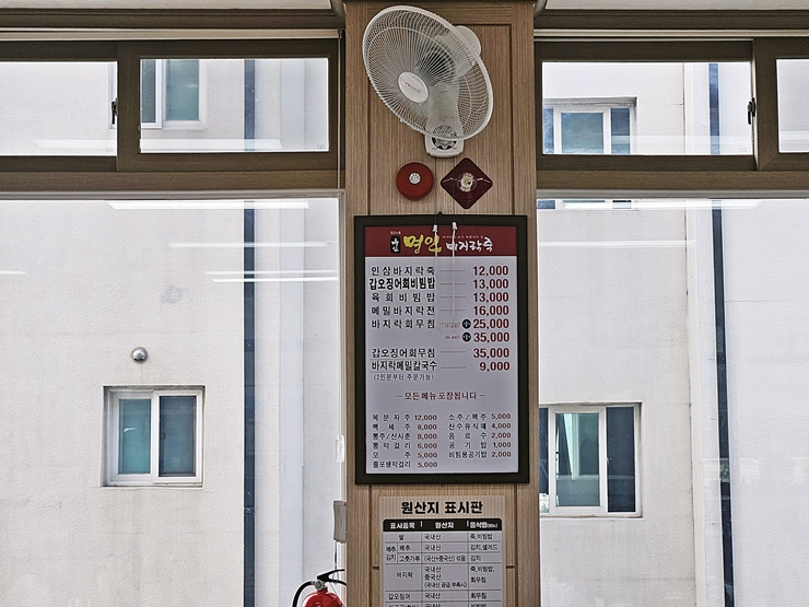 메뉴. 인삼 바지락 죽, 갑오징어 회 비빔밥, 육회 비빔밥, 메밀 바지락 전, 바지락 회 무침, 갑오징어 회 무침과 바지락 메밀 칼국수를 판매하고 있고 그 밖에 주류와 음료도 판매하고 있다. 일정이 타이트하고 운전을 해야 했기 때문에 술은 주문하지 않고 다양한 요리만 즐기기로 했다. 난 술을 참 좋아하지만, 이렇게 일이 있을 때면 단호하게 술을 마시지 않는다. 역시 매사에 단호하고 엄정한 나.