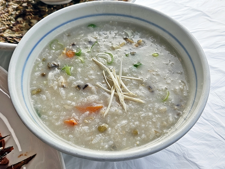 인삼 바지락 죽. 바지락 죽 위에 살포시 인삼이 올라가 있는 모습이다. 인삼을 갈아서 같이 넣었지 않았을까 싶었는데 보기 좋게 나의 예상을 회피했다. 인삼 외에 파, 당근과 녹두 등 여러 채소들이 들어있다. 바지락 죽은 그 자체만 먹어도 참 맛있지만 이렇게 몸에 좋은 채소와 함께 먹으면 그 맛이 더욱 각별하다.