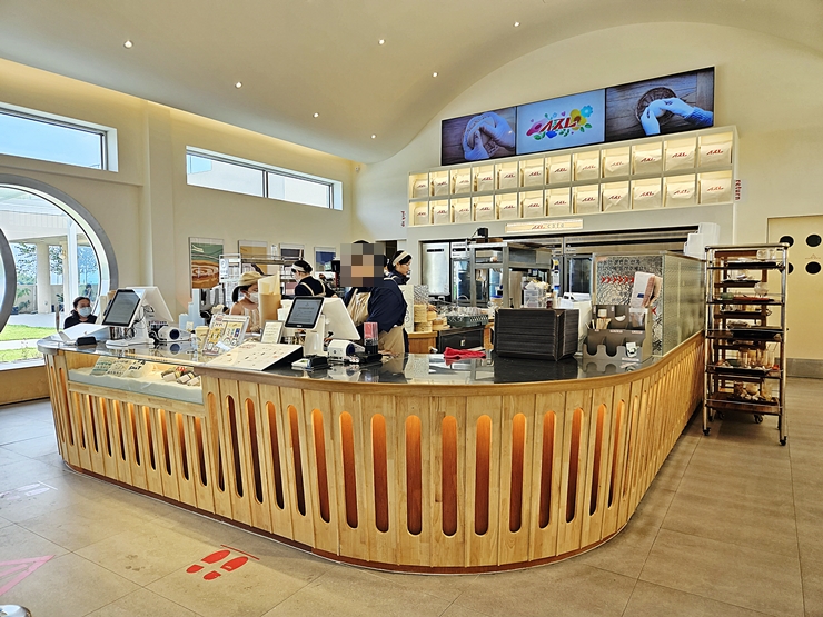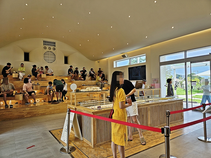 평일에 방문했는데 고객들이 굉장히 많았다. 옷 차림을 보니 나처럼 출장을 온 것이 아니라 가족, 커플 단위로 방문을 한 것 같았다. 평일에 이렇게 기분 좋은 소풍을 하다니. 상당히 부러웠다. 내부는 굉장히 모던한 분위기로 꾸며져 있는데 이런 분위기가 인기를 끌게 하는 요소인 것 같았다. 빵 집 한 쪽에는 앉을 수 있는 공간을 만들어서 시원한 바람을 쐬며 빵을 먹을 수 있게 해놨다.