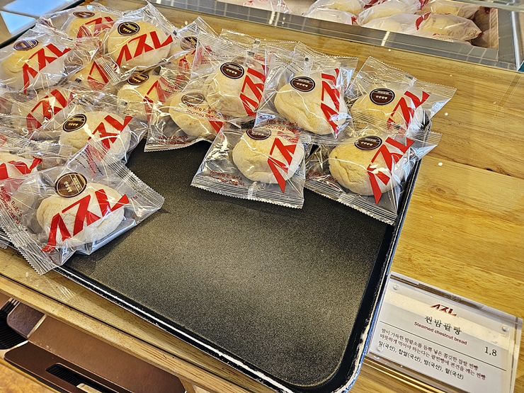 찐 밤 팥빵. 팥빵은 찐빵 중에서 가장 대중적이고 인기가 많은 빵이다. 거기에 밤을 넣었으니 맛이 없을 수 없고, 맛이 없을 수 없지. 이 찐 밤 팥빵은 나도 하나 먹으려고 구매했다. 미리 만들어져 있기 때문에 따뜻함은 느낄 수 없었지만 쫀득한 식감이 일품이었다. 거기에 팥소와 밤도 많이 들어 있어서 참 맛이 좋았다.