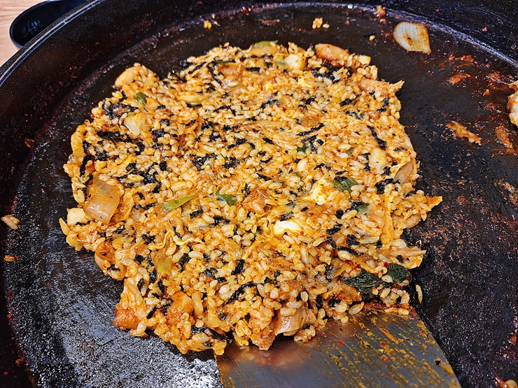 고기를 맛있게 먹었으면 한국인의 유구한 전통이 깃든 볶음밥을 먹어야지. 이런 철판에 고기를 구운 후 볶음밥을 먹지 않으면 그것만큼 큰 죄악이 없다. 우리 모두 죄를 짓지 않기 위해 꼭 볶음밥을 먹도록 하자. 볶음밥은 무료로 제공이 되는데, 참으로 큰 혜택이 아닐 수 없다. 그렇다고 무작정 볶지 말고 먹을 수 있는 양만 볶아 먹도록 하자.