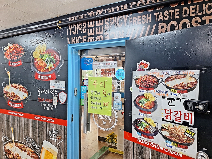홍춘천치즈닭갈비는 프랜차이즈인 것 같다. 매장은 빨간 타일로 개성을 나타냈는데 은근히 닭갈비와 잘 어울리는 색이다. 우리가 방문했을 때는 가족 단위로 보이는 고객이 몇 팀 있었다. 우리는 남은 좌석 중에서 최대한 조용하고 시원한 곳으로 자리를 잡기로 했다. 여름에는 시원한 곳이 최고다. 무더운 여름에 이렇게 시원한 에어컨 바람을 반갑게 맞이할 수 있는 것은 캐리어 선생의 공이 크다. 오, 그에게 축배를.