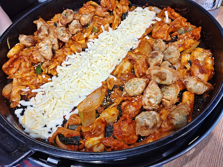 짠. 아름다운 치즈닭갈비의 모습. 함께 온 학우와 싸우지 말라는 뜻으로 치즈를 가운데에 깔아주었다. 오호홋, 나 이런 센스 무척 좋아해요. 닭갈비는 다 익어 나오기 때문에 치즈가 녹으면 그 후에 맛있게 먹으면 된다. 만두의 양이 상당히 많구나. 나와 학우 모두 만두를 좋아하기 때문에 부담 없이 먹을 수 있다.