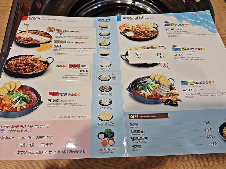 메뉴. 치즈닭갈비, 김치치즈닭갈비, 홍춘천닭갈비, 국물닭갈비, 새우치즈닭갈비과 해물국물닭갈비를 판매하고 있다. 거기에 볶음밥, 치즈볶음밥, 날치알볶음밥과 공기밥도 준비 되어 있다. 닭갈비를 주문하면 튀김을 서비스로 제공하는 행사도 하고 있었다. 우리는 가장 기본적이고 정석적인 치즈닭갈비를 주문했다.