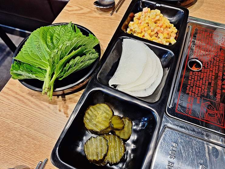 반찬. 닭갈비를 먹을 때 꼭 필요한 깻잎, 콘샐러드, 쌈무와 피클이 나온다. 닭갈비 가게에서 흔하게 볼 수 있는 반찬들이다. 반찬을 많이 먹으면 닭갈비를 많이 먹지 못하는 불상사가 일어나기 때문에 반찬은 적당히 먹고 닭갈비를 많이 먹는 센스를 발휘 하도록 하자.