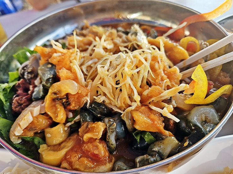 어느 정도 해산물을 먹은 후 슥슥 비벼서 맛있게 냠냠. 물회의 간은 자극적이지 않다. 자극적인 맛의 물회의 경우 처음에는 맛있게 먹을 수 있지만, 나중에 가면 쉽게 물린다. 하지만 채석강바다길식당의 물회는 자극적이지 않으면서도 감칠맛이 과하지 않게 느껴지는 맛이라서 끝까지 맛있게 먹을 수 있었다. 실로 밸런스가 잘 맞는 물회라고 할 수 있다.