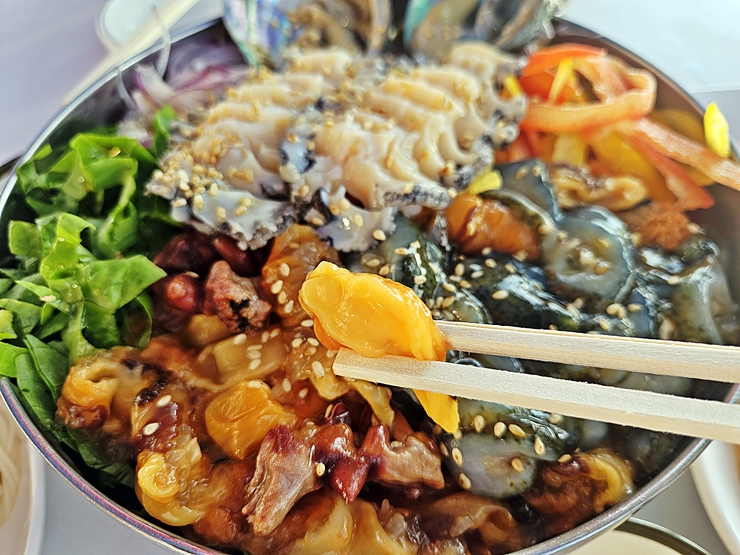 해산물 중에서 내가 가장 사랑해 마지 않는 멍게. 멍게는 정말 사랑하지 않을 수 없다. 씁쓸함과 달콤함이 같이 느껴지는 멍게의 그 맛은 참 감미롭다. 난 초장을 좋아하지 않는 편이라서 이런 해산물을 먹을 때 그냥 먹거나 간장을 살짝 찍어 먹는 편인데, 채석강바다길식당의 멍게는 그냥 먹어도 충분히 맛이 좋았다.