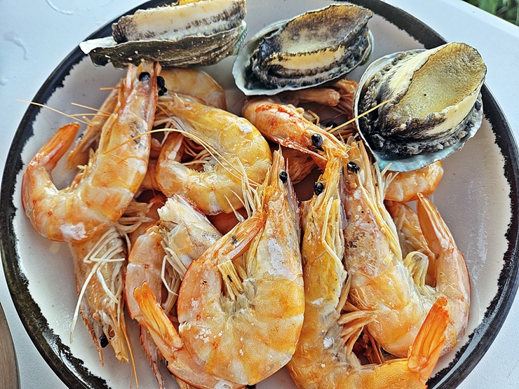 전복대하찜. 대하라고 적혀 있지만 생긴 것을 보면 흰다리새우인 것 같다. 대하는 양식이 되지 않기 때문에 대하라고 불리는 새우는 거의 다 흰다리새우인 것이 현실이다. 대하면 어떻고, 흰다리새우면 어떨까. 맛있으면 그만이다. 전복과 새우는 부드럽게 잘 졌다. 전복은 부드러운 식감을 잘 느낄 수 있고 전복 특유의 눅진한 맛도 잘 느낄 수 있었다. 새우는 역시 새우다. 부안에서 바다를 바라보며 신선하고 맛있는 해산물을 먹고 싶다면 꼭 한 번 가볼 것을 추천하는 곳이다.