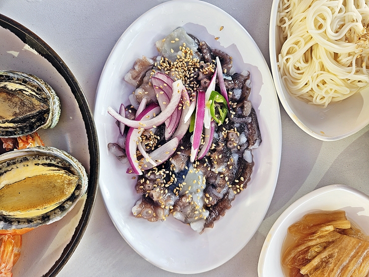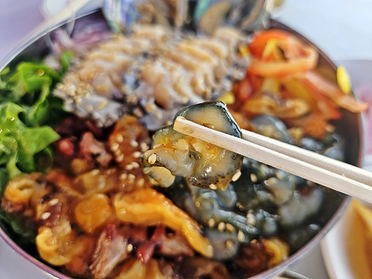 해삼. 해삼은 처음 씹을 때는 굉장히 단단한데 씹으면 씹을 수록 부드러워지는 것이 특징이다. 해삼은 비릿한 맛과 고소함이 같이 느껴지는데 이러한 매력적인 맛 때문에 매니아들이 많다. 난 해삼은 일부러 찾아 먹는 편은 아니고 있으면 먹는 편이다. 참 다행스럽게도 난 멍게를 좋아하고, 같이 간 지인은 해삼을 좋아해서 분란 없이 잘 먹을 수 있었다.
