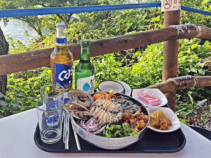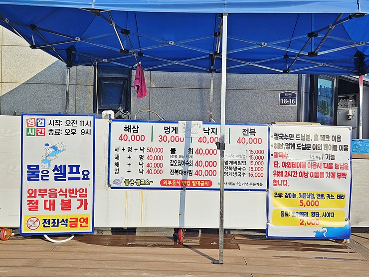 메뉴. 해삼, 멍게, 갑오징어무침,낙지, 전복, 물회,갑오징어숙회, 전복대하찜, 바지락비빔밥, 멍게비빔밥, 전복냉국수, 멍게냉국수와 칼국수 등을 판매하고 있다. 칼국수만 먹는 고객의 경우 밖에서 먹는 것은 안 된다고 한다. 부안 출장 때 가장 기뻤던 것이 소주가 저렴하다는 것이었는데, 이곳은 서울 물가와 동일하다. 하지만 괜찮다. 바다를 바라보며 소맥 한 잔 하는 것은 큰 축복임에 틀림 없으니.