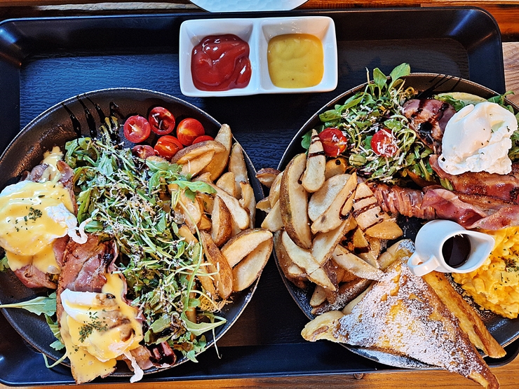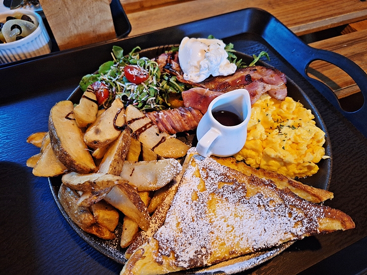 내가 주문한 브런치 플래터. 프렌치 토스트, 감튀, 샐러드, 수란, 베이컨과 스크램블 에그의 구성이다. 프렌치 토스트가 두 조각 나와서 이 역시 짝꿍과 함께 나눠 먹었다. 난 이런 류의 브런치를 딱히 찾아 먹는 편이 아닌데, 짝꿍이 좋아해서 주문한 것이다. 역시 짝꿍을 위하는 멋진 나. 브런치 플래터는 상대적으로 베이컨 에그 베네딕트에 비해 평범한 맛이었지만, 짝꿍은 동네에서 먹는 것보다 훨씬 맛있다며 만족감을 표했다. 그래. 그거면 된 거다. 남양주에서 반려동물과 함께 분위기 좋은 곳에서 맛있는 브런치를 먹고 싶다면 한 번 가볼 것을 추천하는 곳이다.