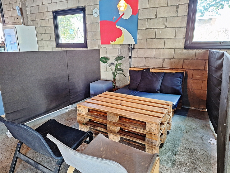 우리가 자리를 잡은 팔레트 테이블. 나무 팔레트를 테이블로 활용했고. 소파와 간이 의자의 구성으로 되어 있다. 이런 나무 팔레트는 예전 직장에서 상당히 많이 사용했는데, 다시 보니 괜히 반갑네. 요새는 환경 보호를 위해 이런 나무 팔레트보다 재활용이 가능한 플라스틱 팔레트를 주로 사용한다. 환경 보호는 중요한 것이니 우리 모두 환경을 보호하기 위해 음식물 쓰레기를 최소로 유지하도록 하자.
