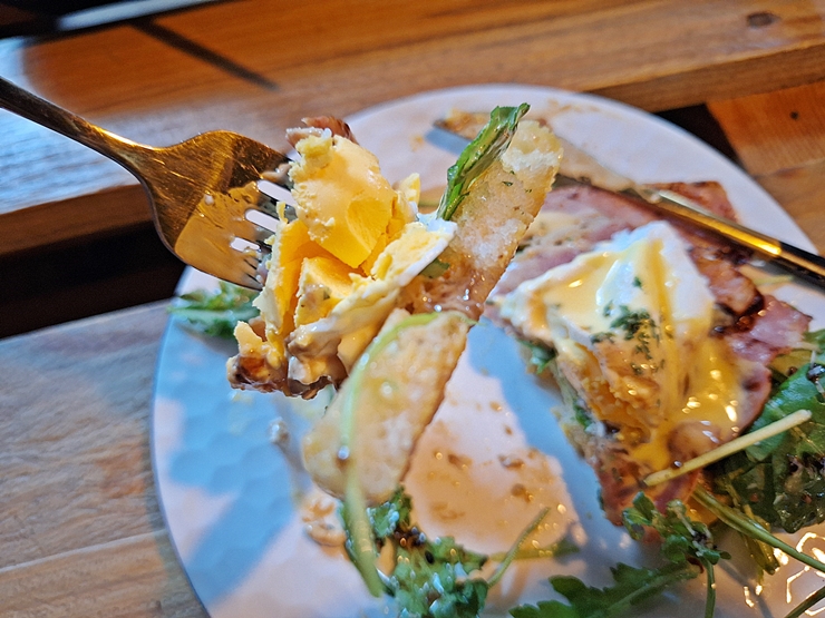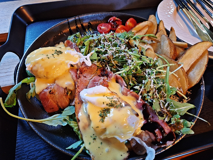 짝꿍이 주문한 베이컨 에그 베네딕트. 베이컨 에그 베네딕트 두 개와 샐러드, 방울 토마토와 감튀가 나온다. 베이컨 에그 베네딕트가 두 개 나오니 짝꿍과 나눠 먹기로 했다. 베이컨 에그 베네딕트 위에 치즈 소스가 상당히 풍부하게 뿌려져 있는 것이 인상 깊다. 고소하고 느끼한 맛이 일품인 치즈 소스. 건강에 그리 좋지 않지만, 먹을 수 있을 때 먹어 놓도록 하자.