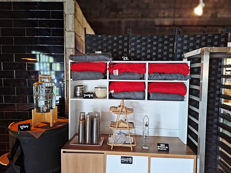 반려동물을 데리고 온 고객들을 위해서 동물용 물 그릇이 따로 준비 되어 있고, 앞치마와 담요도 준비 되어 있다. 이러한 세심한 센스는 참으로 좋다. 나와 짝꿍은 고양이들에게 물을 주기 위해서 물 그릇 하나를 가져갔다. 고양이들이 더워서 그런지 물을 아주 맛있게 마시더라. 역시 수분 섭취는 중요하다.