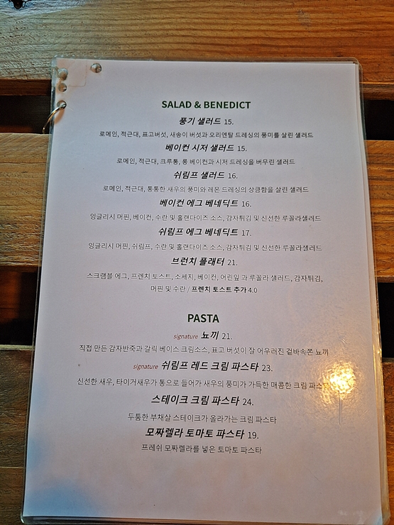메뉴. 풍기 샐러드, 베이컨 시저 샐러드, 쉬림프 샐러드, 베이컨 에그 베네딕트, 쉬림프 에그 베네딕트, 브런치 플래터, 뇨끼, 쉬림프 레드 크림 파스타, 스테이크 크림 파스타, 모짜렐라 토마토 파스타, 루꼴라 하몽피자, 통벌꿀집 고르곤졸라 피자, 페퍼로니 피자, 마르게리따, 감바스와 에그인헬을 판매하고 있다. 음료도 있는데 음료는 따로 마시지 않을 거여서 찍지 않았다. 우리는 베이컨 에그 베네딕트와 브런츠 플래터를 주문했다. 주문은 카운터에서 하면 되고 선불로 결제한다.