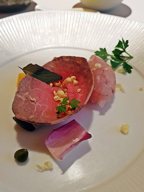 한우와 민어를 사용한 요리. 한우는 아롱사태 부위를 사용했다. 한우와 민어의 조합은 상당히 이색적이었는데, 이 조합이 의외로 이질적이지 않고 부드럽게 잘 어울렸다. 이런 이질적인 조합을 밸런스 있게 만드는 것이 바로 요리 실력이겠지.