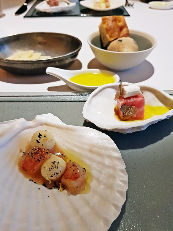 전채로 나온 한입 요리. 참치와 어쩌고 저쩌고 등이 나왔다. 참치는 대뱃살 부위가 큐브 형태로 나오는데 상당히 맛이 좋았다. 마치 참치 전문점에서 비싼 값을 줘야 먹을 수 있는 것 같은 느낌이었다. 다른 것도 맛있었는데 기억이 잘 나지 않는다.