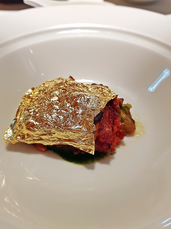 라자냐. 라자냐 위에 금박을 입힌 것이 인상 깊었다. 토마토 소스 본연의 맛을 잘 살려서 자극적이지 않고 은은한 감칠맛이 나는 것이 특징이었다. 금박은 데코레이션으로 입힌 것이겠지만 대접을 받는 것 같아 괜히 기분이 좋았다.