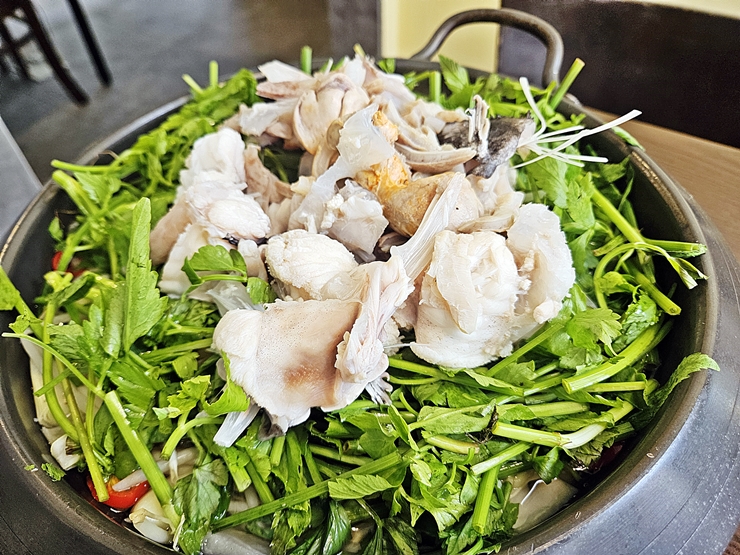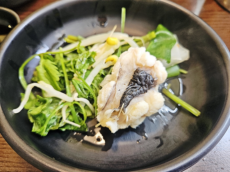 아귀 수육. 잘 삶은 아귀와 함께 미나리, 양파, 콩나물과 고추 등 다양한 채소가 함께 나온다. 신선한 아귀 간과 아귀 내장도 당연히 함께 나온다. 사진을 보니 또 다시 먹고 싶구나. 소중한 아귀 간은 같이 간 일행에게 양보하고 난 내장과 살을 먹었다. 아귀 간을 양보할 정도로 배려심이 많은 나. 참으로 멋진 모습이 아닐 수 없다.