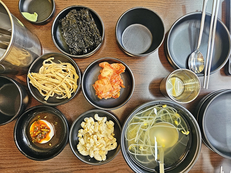 반찬. 김, 어묵, 연두부, 김치, 마카로니 샐러드와 콩나물 국이 나온다. 다른 반찬은 평범했는데 콩나물 국이 맛이 깊고 진했다. 요새 만족스러운 콩나물 국을 자주 접하고 있다. 예전에는 이런 걸 왜 먹나 싶었는데 내 입맛이 변한 것인지, 아니면 콩나물 국 수준이 높아졌는지 잘 모르겠다. 콩나물 국을 떠서 마시니 술을 마시지 않았음에도 저절로 해장이 되는 기분이었다. 내 몸에 아직 알코올이 많이 남았나보다.