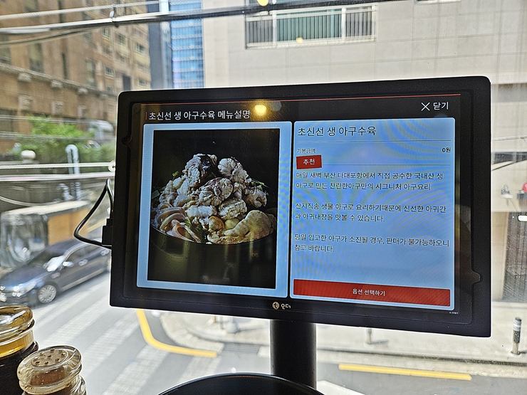 우리가 주문한 생 아귀 수육. 부산 다대포항에서 직접 공수한 국내산 생 아귀라고 한다. 신선한 아귀 내장과 간을 즐길 수 있으니 이걸 시키는 것이 인지상정이지. 빠르게 주문하기를 누른 후 정갈한 자세로 아귀 수육이 나오길 기다렸다.